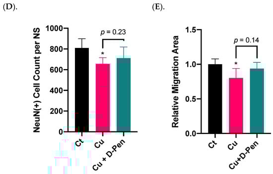 To prove the role of Cu in regulating adult neurogenesis, we used a Cu chelating agent D-Pen to examine the growth of neurospheres following Cu chelation treatment. As the first step toward D-Pen chelation, we investigated whether treatment by D-Pen itself would affect the neurosphere growth and differentiation. Data in Figure 3 demonstrated that the presence of D-Pen at 20 µM in culture medium significantly increased the NeuN(+) cell counts by 14% (p < 0.05) (Figure 3B); it also increased the cell migration area by 18% (p < 0.05) (Figure 3A,C). Noticeably, D-Pen at 50 µM caused the largest migration by 21% (p < 0.05) as well as the mild NeuN signal translocation from nuclei to cytosol (Figure 3A). At 100.0 µM D-Pen, a widespread NeuN translocation was observed. Thus, we decided to use 20-µM D-Pen for subsequent chelation experiments.