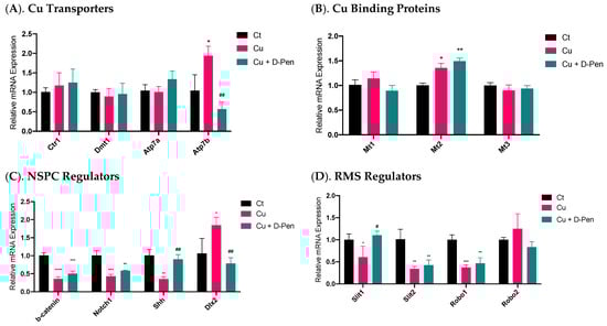 Expressions of mRNAs encoding critical modulators of Cu homeostasis and SVZ adult neurogenesis as affected by Cu status in culture medium. (A). Relative mRNA expressions of Cu transporting proteins in neurospheres, including Ctr1, Dmt1, Atp7a, and Atp7b. (B) Relative mRNA expressions of Cu binding proteins in neurospheres, including Mt1, Mt2, and Mt3. (C). Relative mRNA expressions of modulators of adult NSPCs in adult SVZ, including b-catenin, Notch1, Shh, and Dlx2. (D) Relative mRNA expressions of neuroblast migration modulators in adult RMS, including Slit1, Slit2, Robo1, and Robo2. For panel A-D, data represent mean ± SD, n = 3/group. * p < 0.05, ** p < 0.01, *** p < 0.001, **** p < 0.0001, as compared with the control group; # p < 0.05, ## p < 0.01, as compared with the Cu treatment group; 10 µM Cu and 20 µM D-Pen were used as previously demonstrated.