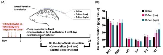 To verify the observed Cu participation in adult neurogenesis from our in vitro neurosphere D-Pen experiments, we established an in situ ICV infusion model in mice for short-term (7 days) and long-term (28 days) D-Pen treatments (Figure 6A). Following long-term D-Pen ICV infusion, the AAS was used to quantify Cu concentrations in multiple brain regions, i.e., SVZ, RMS, OB, hippocampus, frontal cortex, and striatum. In the SVZ, the high-dose D-Pen infusion significantly decreased Cu levels by 21.4% (30.6 ± 6.2 µg/g; p < 0.05), compared to the saline infused controls (38.9 ± 2.7 µg/g). D-Pen infusion at the high dose also decreased the Cu levels by 24.2% (p = 0.10) and 38.0% (p = 0.11) in hippocampus and frontal cortex, respectively, compared to the saline controls, although the levels of Cu decreases did not reach statistical significance. Cu levels in the RMS, OB, hippocampus, and frontal cortex, however, did not change significantly after D-Pen infusion (Figure 6B). Understandably, the SVZ, being a part of the ventricular wall directly encountering the ventricular CSF, would sense the impact of D-Pen (which was delivered directly to the brain ventricle) more readily than other brain regions. Interestingly, D-Pen infusion elevated the Cu concentration in the striatum by 45.1% (p = 0.19) and 82.1% (p < 0.05) after the low-dose and high-dose D-Pen treatment, respectively. These data suggest that ICV infusion of D-Pen was able to decrease the Cu level in the SVZ while spared other brain regions.