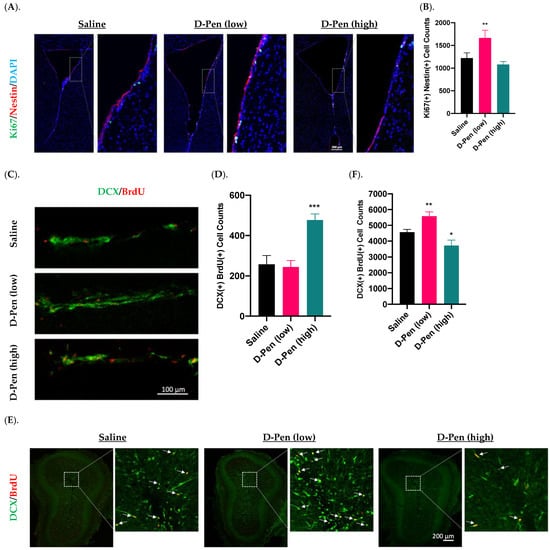Cell counting results, while revealing no changes in NSCs by D-Pen (low) (25.0 ± 4.4 per mm LV wall), showed a 46.2% decline in NSCs by D-Pen (high) infusion (14.0 ± 2.6 per mm LV wall, p < 0.05), in comparison to the saline infusion group (26.0 ± 3.6 per mm LV wall) (Figure 8D). Furthermore, quantification of aNSCs demonstrated that D-Pen (high) infusion greatly inhibited the aNSC number (2.5 ± 0.5 per mm LV wall) by 58.3% compared to saline (6.0 ± 1.3 per mm LV wall) (p < 0.05), although the increase by D-Pen (low) (8.3 ± 1.2 per mm LV wall) was not statistically significant (p = 0.08) (Figure 8E). Interestingly, the aNSC/qNSC ratio revealed that D-Pen (low) infusion upregulated the ratio of aNSCs to qNSCs in SVZ (50.3% ± 3.2%), as compared to the saline (30.0% ± 5.3%); but the ratio remained unchanged following D-Pen (high) treatment (23.7% ± 8.4%) (Figure 8F). Overall, these data suggest that the long-term, low-dose D-Pen infusion likely stimulated the SVZ adult neurogenesis without depleting the NSPC pool, while the high-dose D-Pen infusion may partially compromise the long-term repopulating potential of this NSPC pool.