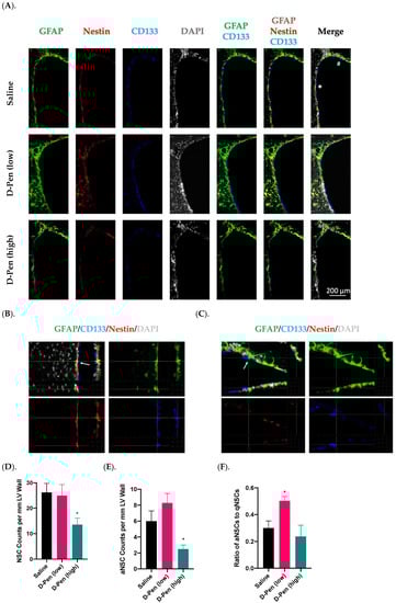 Adult NPSC pools in SVZ following long-term ICV D-Pen infusion. (A). Adult NSPC pool and cell identities revealed by staining with GFAP, CD133, and Nestin. Scale bar = 200 µm. (B). The asterisk-marked SVZ of a saline-infused mouse showing an aNSC: GFAP(+)-CD133(+)-Nestin(+). An arrow was used to show signal overlapping within this cell. (C). The pound-marked SVZ of a saline-infused mouse showing a representative qNSC: GFAP(+)-CD133(+)-Nestin(-). An arrow was used to show signal overlapping within this cell. (D). Quantification of GFAP(+)-CD133(+) NSCs in the anterior SVZ. (E). Quantification of GFAP(+)-CD133(+)-Nestin(+) aNSCs in the anterior SVZ. (F). Ratio of aNSCs to qNSCs in the anterior SVZ. For panels (D–F), data represent mean ± SD, n = 3/group. * p < 0.05, as compared with the saline-infused controls.