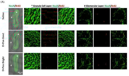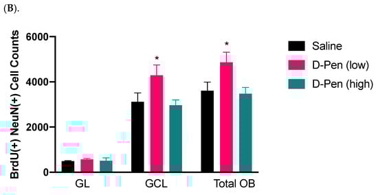 The newly generated NeuN(+)/BrdU(+) mature neurons arrive in the OB in two distinct areas, i.e., granule cell layer (GCL) and glomerular layer (GL) (Figure 9A). Long-term ICV infusion of D-Pen in mice revealed that, in the GCL, D-Pen (low) treatment significantly increased the NeuN(+)-BrdU(+) cells (4298 ± 449 per animal) by 37.8% compared to the saline group (3120 ± 394 per animal) (p < 0.05), while no changes were detected in the D-Pen (high) group (2966 ± 235 per animal). In the GL, however, no difference was observed among the three treatment groups. By combining the data from GCL and GL together, it was evident that D-Pen (low) treatment significantly increased the neurogenesis in OB (4868 ± 443 per animal) by 34.7% as compared with saline controls (3614 ± 380 per animal) (p < 0.05); but D-Pen (high) treatment did not show such a stimulatory effect. The findings suggest that D-Pen (low) treatment appeared likely to activate SVZ adult neurogenesis through the SVZ-RMS-OB axis.