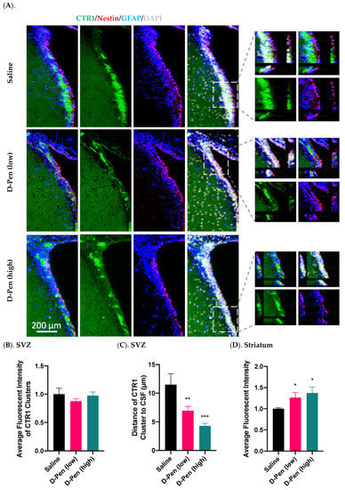 The SVZ possesses the highest Cu level in brain [,,]. We set out to investigate if chelation of Cu by D-Pen may interfere the expression of proteins responsive to cellular Cu regulation in the SVZ. Data in Figure 10A showed that CTR1 was expressed in clusters in the SVZ, and its expression was much higher in the SVZ than in adjacent brain regions such as striatum. Magnified images highlighted the colocalization of CTR1 with Nestin and GFAP, suggesting an enriched expression in aNSCs (Figure 10A). However, since the three fluorescent signals for CTR1, GFAP, and Nestin were only partially overlapped, it was not entirely certain if the strong CTR1 expression was uniquely located in aNSCs. In addition, quantification of the average fluorescence intensity of SVZ CTR1 clusters did not reveal any differences among treatments (Figure 10B); but the striatal CTR1 was upregulated by 26.2% and 37.2% in the D-Pen (low) and D-Pen (high) group as compared to the controls, respectively (p < 0.05) (Figure 10D). Interestingly, we found that the average distance of CTR1 clusters to the CSF decreased by 39.6% and 62.8% by D-Pen (low) treatment (6.9 ± 0.77 µm) and D-Pen (high) treatment (4.3 ± 0.47 µm), respectively (p < 0.05), in comparison to control group (11.5 ± 1.9 µm) (Figure 10C). These data indicate that the D-Pen infusion did affect the expression of Cu transporter CTR1 in the SVZ and striatum.