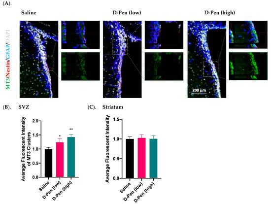 Expression of MT3 in SVZ and striatum following long-term ICV D-Pen infusion. (A) MT3 expression in the SVZ and colocalization with adult NSPCs. MT3 enrichment in the SVZ was further 3D-magnified for improved observations. Scale bar = 200 µm. (B) Quantification of MT3 immunofluorescent intensity in SVZ using multiple slices per brain. (C) Quantification of MT3 immunofluorescent intensity in striatum using multiple slices per brain. For panels (B,C), data represent mean ± SD, n = 3/group. * p < 0.05, ** p < 0.01, as compared with the controls.