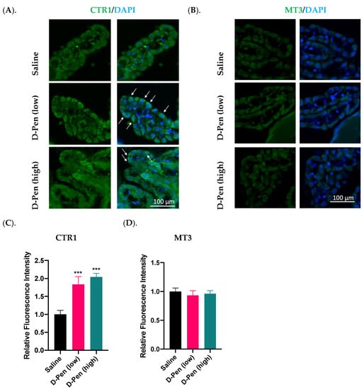 Expression of Cu regulatory proteins in the choroid plexus following long-term ICV infusion of D-Pen. (A). Expression of CTR1 in the choroid plexus. White arrows indicate CTR1 translocation toward the apical aspect facing the CSF. Scale bar = 100 µm. (B). Expression of MT3 in the choroid plexus. Scale bar = 100 µm. (C). Quantification of average CTR1 immunofluorescent intensity in choroid plexus using multiple slices per brain. (D). Quantification of average MT3 immunofluorescent intensity in choroid plexus using multiple slices per brain. For panels (C,D), data represent mean ± SD, n = 3/group. *** p < 0.001, as compared with the controls.