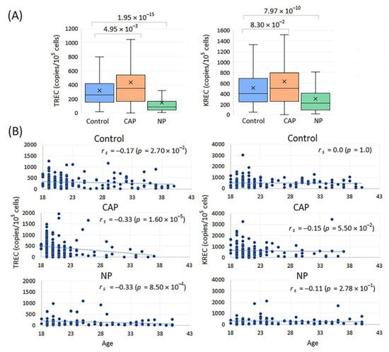 2.2.2. TREC and KREC Levels in Healthy Controls, CAP and NP Patients