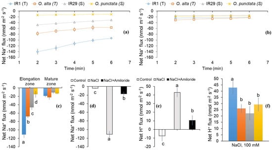 Cytoplasmic Na+ exclusion is an active mechanism that is fueled by proton-motive pump force generated by H+-ATPase []. Accordingly, steady state net H+ fluxes were measured from the root elongation zone. Salt-tolerant rice cultivar IR1 showed significantly (p < 0.05) higher net H+ influx in root apex than other tested genotypes, i.e., IR29, O. alta and O. punctata (Figure 1f). Roots pre-treated with amiloride showed suppression in the net H+ influx (>80%; Figure 1e) concurrent with the inhibition of net Na+ efflux, consistent with the above notion of operation of SOS1-mediated Na+/H+ exchanger in rice root apex.
