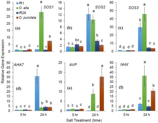 To provide insights into the essentiality of transcriptional regulation in SOS1-mediated Na+ exclusion, expression levels of different genes such as SOS1, SOS2 (CIPK24), SOS3 (CBL4), NHX1, AHA7 and AVP were analyzed in the root apex of tested genotypes and wild rice (Figure 2). A 24 h salt treatment significantly upregulated the expression levels of SOS1, SOS2 and SOS3 genes in all the tested genotypes and wild rice (Figure 2a–c). The highest level of SOS1 transcript was detected in wild rice genotypes, with ~5–6-fold higher transcript level recorded in salt-tolerant wild rice O. alta followed by O. punctata (Figure 2a). There was no significant difference in SOS1 expression observed in cultivated rice (IR1-tolerant and IR29-sensitive) under both zero salinity (0) and 24 h salinity exposure. Interestingly, expression levels of SOS2 and SOS3 were markedly upregulated under 24 h salt treatment in all genotypes. Salt-tolerant genotypes (IR1 and O. alta) showed ~3–4-fold higher expression levels of SOS2 and SOS3 compared to salt-sensitive genotypes (Figure 2b,c). In addition, wild rice species (O. alta and O. punctata) also had much higher salt-induced NHX1 expression levels compared to the cultivated rice IR1 and IR29 (3–4-fold difference, significant at p < 0.05; Figure 2f).