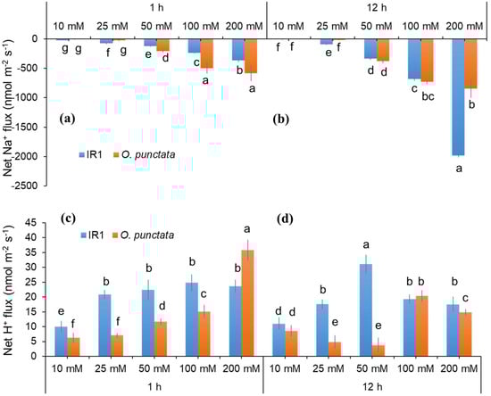 Supporting the notion that H+ pumping plays a significant role in Na+ exclusion, dose- and time-dependent H+ fluxes were also measured concurrent to Na+ fluxes, using one cultivated (IR1) and one wild (O. punctata) genotype. Similar to data for Na+ flux, salt-tolerant rice cultivar IR1 showed relatively higher H+ flux after 1 h and 12 h of salinity treatment (Figure 3c,d). The magnitude of net H+ influx in wild rice was increased in a concentration-dependent manner after exposure to salinity for 1 h and was significantly higher under 200 mM NaCl treatment (Figure 3c). At the same time, there was no consistent trend for H+ influx observed in wild rice species after 12 h of salinity exposure (Figure 3d). However, salt-tolerant cultivar IR1 showed ~5–6-fold higher net H+ influx under lower salt levels (25 and 50 mM NaCl). From these data, it appears that salt-tolerant cultivated rice IR1 tends to rely on active Na+ exclusion (pumping) from the roots while wild rice species probably do not activate H+ pumps for removing excessive Na+ from the cytosol.