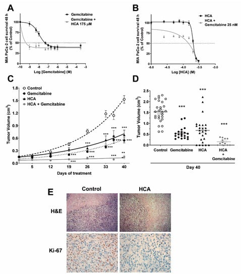 Efficacy of HCA against pancreatic cancer. (A) Concentration-dependent inhibition of human pancreatic cell (MIA PaCa-2) growth by gemcitabine and gemcitabine in combination with HCA (175 µM) over 48 h. (B) Concentration-dependent inhibition of human pancreatic cell (MIA PaCa-2) growth by HCA and HCA in combination with gemcitabine (25 nM) for 48 h (mean ± SEM from 3 independent experiments performed in quadruplet). (C) Effects of the vehicle alone (control), gemcitabine (100 mg/kg, i.p., twice weekly), HCA (200 mg/kg, p.o., daily), or HCA + gemcitabine (100 mg/kg, p.o., daily + 100 mg/kg, i.p., once weekly) on MIA PaCa-2-derived tumor growth in mice over 40 days. (D) Tumor volumes after a 40-day treatment (mean ± SEM): control, 27 tumors (n = 18, 8 males and 10 females); gemcitabine, 20 tumors (n = 15, 4 males and 11 females); HCA, 25 tumors (n = 17, 6 males and 11 females); and HCA + gemcitabine, 12 tumors (n = 6, 2 males and 4 females). (E) Histopathological analysis of the tumors obtained from vehicle and HCA-treated animals (40× magnification). Student’s t-test: * < p 0.05, ** p < 0.01, *** p < 0.001 with respect to the controls. HCA, 2-hydroxycervonic acid; H&E, hematoxylin and eosin; Ki-67, protein proliferation marker.