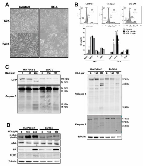 Exposure to HCA (200 µM for 48 h) produced morphological changes in MIA PaCa-2 pancreatic cancer cells, which became rounder with some membrane blebbing but without a loss of membrane integrity (Figure 2A). When ethidium bromide-stained MIA PaCa-2 cells were analyzed by flow cytometry, HCA induced a significant increase in the sub-G1 peak, indicative of DNA fragmentation (Figure 2B, Supplementary Figure S2A). This effect of HCA on the sub-G1 peak was concentration-dependent, and it also differed at 24 h (control 1.93 ± 0.25%; HCA 150 µM 2.63 ± 1.25%; HCA 175 µM 16.10 ± 3.10%) and 48 h (control 7.17 ± 0.78%; HCA 150 µM 8.97 ± 0.68%; HCA 175 µM 35.62 ± 7.90%: Figure 2B, Supplementary Figure S2A). In addition, exposure to HCA for 48 h caused a significant concentration-dependent decrease in the proportion of cells at G0/G1 relative to the control cells (control 79.20 ± 2.43%; HCA 150 µM 65.99 ± 3.20%; HCA 175 µM 36.55 ± 6.20%: Figure 2B, Supplementary Figure S2A).