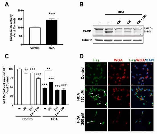 HCA enhances Caspase-3/-7 activity and induces apoptosis in pancreatic cancer cells mainly through the extrinsic pathway. (A) Caspase 3/7 activity was measured in MIA PaCa-2 cells as a luminescence read-out (Caspase-3/7 Glo assay) after incubation with HCA (200 µM for 48 h: the bars correspond to the mean ± SEM values of 2 independent experiments performed in triplicate). (B) Representative immunoblot of the effects of C8i (inhibitor zIETD-fmk, 50 µM), C9i (inhibitor zLEHD-fmk, 50 µM), and C8i+C9i (zIETD-fmk+zLEHD-fmk, 50 + 50 µM) on PARP proteolysis in MIA PaCa-2 cells treated with HCA for 48 h. MIA PaCa-2 cells were pretreated with the inhibitors for 1.5 h before exposure to HCA (200 µM). (C) Effects of C8i, C9i, and C8i+C9i on the survival of MIA PaCa-2 cells treated for 48 h with HCA (the bars correspond to the mean ± SEM of three independent experiments performed in triplicate). (D) Labelling of the Fas receptor (green) and Wheat germ agglutinin (red) in MIA PaCa-2 cells cultured for 48 h in the presence or absence of HCA (150 and 200 µM). Capping of the Fas receptors is indicated with arrows. Scale bar 4 µM. Student’s t-test: ** p < 0.01, *** p < 0.001 with respect to the controls. HCA, 2-hydroxycervonic acid; C8i, caspase 8 inhibitor (zIETD-fmk); C9i, caspase 9 inhibitor (zLEHD-fmk); C8i+C9i, caspase 8 inhibitor + caspase 9 inhibitor (zIETD-fmk+zLEHD-fmk); PARP, Poly (ADP-Ribose) Polymerase; WGA, Wheat germ agglutinin; –, the absence of the drug indicated in the figure.