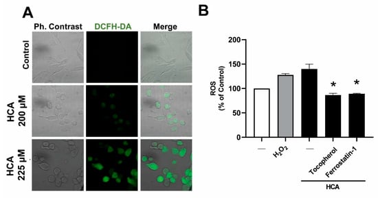 HCA causes an increase in ROS levels. (A) Representative confocal images of MIA PaCa-2 cells cultured for 48 h in the presence or absence of HCA (200 and 225 µM). After then, the cells were incubated with 10 µM dichlorofluorescein diacetate for 30 min at 37 °C. ROS species are shown in green. (B) Ros levels were measured by flow cytometry. MIA PaCa-2 cells were pretreated with ROS scavengers α-tocopherol (100 µM, Vit. E) or Ferrostatin-1 (1 µM) for 1.5 h before exposure to HCA (200 µM) for 48 h. Positive control H2O2 (100 µM) (the bars correspond to the mean ± SEM of three independent experiments). Student’s t-test: * p < 0.05 with respect to the controls. HCA: 2-hydroxycervonic acid. DCFH-DA: 2′, 7′-Dichlorofluorescin diacetate.