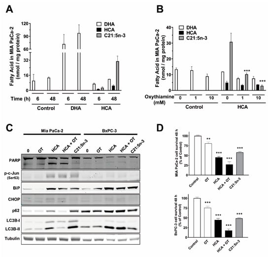 HCA is incorporated into cancer pancreatic cells, and it is metabolized to heneicosapentaenoic acid (C21:5n-3) through α-oxidation. (A) Fatty acid levels (DHA, HCA, C21:5n-3) were quantified by GC after HCA or DHA treatment of MIA PaCa-2 cells (the bars correspond to the mean ± SEM values of 3 independent experiments). (B) MIA PaCa-2 cells were pretreated with oxythiamine (OT, 1 or 10 mM) for 1.5 h before exposure to HCA (150 µM) for 48 h, and the cell’s lipids were extracted and quantified by GC (the bars correspond to the mean ± SEM values of 3 independent experiments). (C) Representative immunoblots of the effect of OT and HCA or C21:5n-3 on ER stress/UPR and autophagy markers in MIA PaCa-2 and BxPC-3 cells. (D) Effect of oxythiamine (OT, 1 mM), HCA (200 µM), HCA plus OT (HCA 200 µM plus OT 1 mM) or C21:5n-3 (200 µM) on the survival of MIA PaCa-2 and BxPc-3 cells treated for 48 h (the bars correspond to the mean ± SEM values of 3 independent experiments performed in triplicate). Student’s t-test: ** p < 0.01, *** p < 0.001 with respect to the controls. HCA, 2-hydroxycervonic acid; DHA, docosahexaenoic acid; C21:5n-3, heneicosapentaenoic acid; OT, oxythiamine; BiP (a.k.a. GRP78), glucose-regulated protein 78; c-Jun, Jun Proto-Oncogene; CHOP (a.k.a. DDIT3), DNA Damage Inducible Transcript 3; LC3B, (a.k.a. ATG8F), Microtubule Associated Protein 1 Light Chain 3 Beta; p62 (a.k.a. SQSTM1), Sequestosome 1; PARP, Poly (ADP-Ribose) Polymerase.