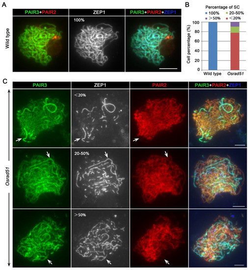 We also detected the assembly status of the synaptonemal complex (SC) in Osrad51 PMCs via an immunolocalization assay employing antibodies against PAIR3, PAIR2, and ZEP1 protein. PAIR3, an axial protein, is essential for homologous pairing [32]. PAIR2 is associated with axial elements proteins, and is released quickly from the chromosomal axes when SC formation is completed. ZEP1 can be used to monitor synapsis in rice [33]. In wild-type PMCs, ZEP1 signals were fully elongated along the completely paired homologous chromosomes at pachytene (Figure 3A). PAIR2 staining presented punctate signals at leptotene. The PAIR2 signals decreased gradually from synaptic chromosomes during zygotene and diminished from chromosomes after synapsis was completed at pachytene [34]. In Osrad51 PMCs, we detected that the PAIR2 signals vanished from the regions where ZEP1 was loaded (n = 30 for PMCs) (Figure 3C, indicated by arrows). In order to detect the location pattern of PAIR2 on Osrad51 chromosomes in more detail, we used an immunolocalization assay combined with a super-resolution structured illumination microscope (SIM). The results showed that the PAIR2 signal disappeared from the synapsed regions (n = 35 for PMCs) (Supplementary Figure S5). We then analyzed 63 Osrad51 pachytene PMCs to measure the level of the SCs (the ratio of the length of ZEP1 to the length of PAIR3) [35,36]. The results showed that 77.8% of the PMCs presented punctuate or short liner ZEP1 signals. Of these, the SC level was <20%. In addition, 12.7% of the PMCs displayed slightly longer ZEP1 stretches, and the SC level was 20–50%. Some long ZEP1 tracks were present along the chromosomes in 9.5% of the PMCs, and the SC level was >50% (Figure 3B). Taken all together, these results suggest that the function of OsRAD51 is pivotal for the full-length synapsis.