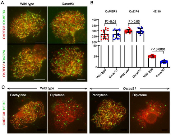 We performed immunolocalization assays in Osrad51 employing antibodies against OsMER3, OsZIP4, and OsHEI10, three proteins that all participate in crossover formation [37,38,39]. OsREC8 was used to indicate meiotic chromosomes, which is a conserved component of the cohesion complex [40]. The number of OsMER3 foci in the wild type (269.4 ± 9.1; n = 17 for PMCs) was comparable to that of the Osrad51 mutant (267.9 ± 8.3, n = 17 for PMCs) at zygotene. The number of OsZIP4 foci in the Osrad51 mutant (297.6 ± 5.1, n = 18 for PMCs) was also almost equal to that in the wild type (296.9 ± 3.4, n = 18 for PMCs) (Figure 4A,B). A previous study showed that HEI10 can indicate the Class I COs [39]. In the wild type, bright HEI10 foci were detected (25.4 ± 0.47, n = 25 for PMCs) at late pachytene, and the foci could also be detected at diplotene (Figure 4B,C). Compared to wild-type, the emergence of the bright dot-like HEI10 foci was delayed in the Osrad51 mutant. At late pachytene, most OsHEI10 signals appeared as sparser foci, and this may be the result of delayed SC assembly. At diplotene, the prominent HEI10 foci were significantly decreased in Osrad51 (12.8 ± 0.43; n = 25 for PMCs) (Figure 4B,C). Taken together, these results suggest that OsRAD51 can affect the crossover formation.