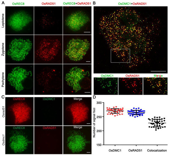 To further investigate the relationship between OsRAD51 and OsDMC1, we conducted a dual immunolocalization assay in wild-type PMCs using specific antibodies against OsRAD51 and OsDMC1 simultaneously. The results of super-resolution SIM on wild-type PMCs revealed that the OsRAD51 signals co-localized with OsDMC1 as bright yellow foci (Figure 5B). Furthermore, quantitative co-localization analysis revealed that the co-located signals accounted for 84% of the OsDMC1 foci and 86% of OSRAD51 foci (n = 39 for PMCs) (Figure 5B,D). These results show that OsRAD51 had considerable colocalization with OsDMC1. Immunostaining for OsRAD51 and OsDMC1 was also performed in the Osdmc1 and Osrad51 mutants, respectively. There were no obvious OsRAD51 signals on Osdmc1 meiotic chromosomes, and the OsDMC1 signal could not be detected in the Osrad51 mutant (n = 30 for PMCs) (Figure 5C). These results indicate that the loading of OsRAD51 and OsDMC1 may be interdependent.