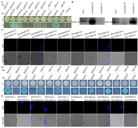 To determine whether OsRAD51 interacts with OsDMC1, we carried out yeast two-hybrid (Y2H) and BiFC assays. The results revealed that OsRAD51 cannot interact with OsDMC1 (Figure 6A,C). In order to verify this result, we implemented CoIP assays. Total proteins were extracted from rice panicles in the meiosis stage. The immunoprecipitates of anti-OsRAD51 were detected by anti-OsDMC1 and the immunoprecipitates of anti-OsDMC1 were detected by anti-OsRAD51. These results showed that OsRAD51 does not interact with OsDMC1 directly (Figure 6B). We also found that OsRAD51A1 can interact with OsRAD51A2, and OsDMC1A can interact with OsDMC1B, but OsRAD51A1, OsRAD51A2, OsDMC1A, and OsDMC1B cannot interact with themselves (Figure 6A,C). In addition, we found that both of these recombinases can interact with OsFIGL1 and OsBRCA2 (Figure 6D). BRCA2 was previously reported to be a positive accelerator in controlling the dynamics of RAD51 and DMC1 focus formation, whereas FIGL1 is a negative regulator in Arabidopsis [42]. We further confirmed these interactions using BiFC assays (Figure 6E). These results imply that BRCA2 and FIGL1 may mediate the functions of these two recombinases in rice meiotic homologous recombination.