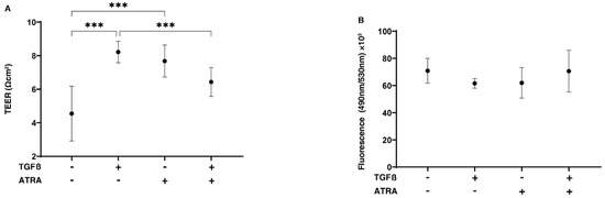 The barrier functions in the 2D-cultured HTM monolayers in the absence and presence of a 5 ng/mL solution of TGF-β2 and/or 10 mM ATRA were evaluated by TEER and FITC dextran permeability measurements, as shown in a previous study [42]. Briefly, the TEER values were measured using a 12 mm-diameter TEER plate (0.4 μm pore size; Corning Transwell, Sigma-Aldrich) in conjunction with an electrical resistance system (KANTO CHEMICAL Co., Inc., Tokyo, Japan). Alternatively, FITC dextran permeability was estimated by measuring the fluorescence intensity of the amount of FITC that permeated through the membrane over a period of 60 min using a multimode plate reader (Enspire; Perkin Elmer, Waltham, MA, USA) at an excitation wavelength of 490 and an emission wavelength of 530 nm.