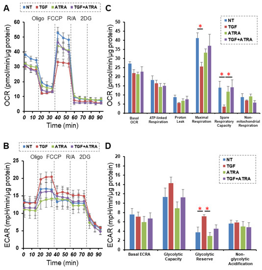 Effects of all-trans retinoic acid (ATRA) on a real-time cellular metabolism analysis of 2D-cultured HTM cells. Two-dimensionally cultured HTM cells untreated (NT—nontreated control) or treated with TGF-β2 (TGF, 5 ng/mL) and/or ATRA (10 μM) were subjected to a real-time metabolic function analysis using a Seahorse XFe96 Bioanalyzer. Panel (A,B): simultaneous measurements of OCR (A) and ECAR (B) at baseline and those subsequently supplemented with Oligo (a complex V inhibitor), FCCP (a protonophore), rotenone/antimycin A (R/A, complex I/III inhibitors), and 2DG (a hexokinase inhibitor). (C,D) Key parameters of mitochondrial respiration (C) and glycolytic flux (D). Basal OCR value was obtained by subtracting OCR with rotenone/antimycin A from baseline OCR. The adenosine triphosphate (ATP)-linked respiration was estimated by subtracting OCR with Oligo from baseline OCR. Proton leak was calculated by subtracting OCR with rotenone/antimycin A from OCR with Oligo. Maximal respiration was calculated by subtracting OCR with rotenone/antimycin A from OCR with FCCP. Spare respiratory capacity was calculated by subtracting baseline OCR from OCR with FCCP. Nonmitochondrial respiration was defined as OCR with rotenone/antimycin A. Basal ECAR was calculated by subtracting ECAR with 2DG from baseline ECAR. Glycolytic capacity was calculated by subtracting ECAR with 2DG from ECAR with Oligo. Glycolytic reserve was calculated by subtracting baseline ECAR from ECAR with oligomycin. Non-glycolytic acidification was defined as the final value of ECAR with 2DG. All experiments were performed in triplicated using fresh preparations (n = 5, total 15). Data are presented as the mean ± SEM. * p < 0.05; ANOVA followed by a Tukey’s multiple comparison test.