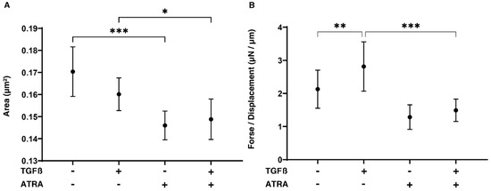 To elucidate the drug-induced effects of ATRA on human TM, which comprises multiple layers, our recently developed an in vitro 3D HTM spheroid model that replicates such a complex human TM structure [24]. Quite interestingly and in contrast to the results related to the 2D HTM monolayers described above, ATRA induced the same effects; that is, ATRA induced the downsizing and softening of the TGF-β2-untreated and -treated 3D HTM spheroids. These were assumed in an in vitro model, replicating the multiple sheet layers of the human TM architecture [24,25] (Figure 3). These functional and physical analyses indicate that ATRA may exert multiple and diverse effects on HTM cells among the several conditions of the TGF-β2-untreated or -treated cells, and the 2D or 3D cultures.