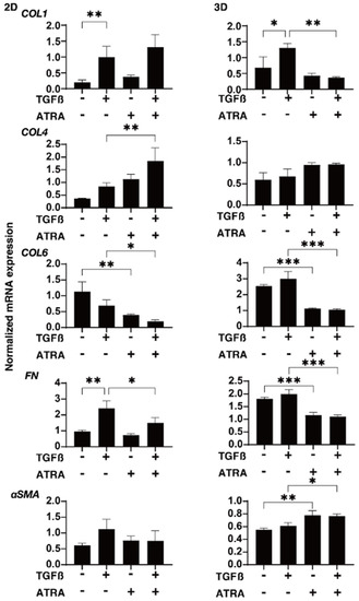 Effects of ATRA on the gene expression of ECM molecules in TGF-β2-treated 2D- and 3D-cultured HTM cells. Two- and three-dimensionally cultured HTM cells untreated (NT) or treated with 5 ng/mL TGF-β2 (TGFβ) and/or ATRA (10 μM) were subjected to quantitative polymerase chain reaction (qPCR) analysis to estimate the expression of mRNA in ECMs (COL1, COL4, COL6, FN, and αSMA). All experiments were performed in triplicate each using freshly prepared 2D HTM cells and 3D HTM spheroids (n = 15–20, total 45–60) in each experimental condition. Data are presented as the mean ± SEM. * p < 0.05, ** p < 0.01, *** p < 0.005; ANOVA followed by a Tukey’s multiple comparison test.