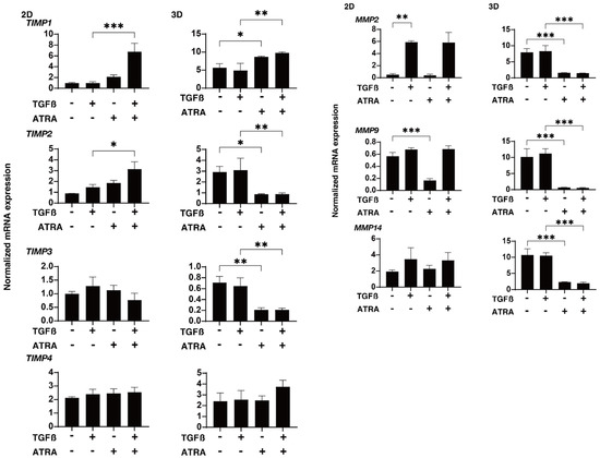 Effects of ATRA on the mRNA expression of TIMPs and MMPs in TGF-β2-treated 2D- and 3D-cultured HTM cells. Two- and three-dimensionally cultured HTM cells untreated (NT; nontreated control) or treated with 5 ng/mL TGF-β2 (TGFβ) and/or ATRA (10 μM) in the absence or presence of 10 μM ATRA were subjected to qPCR analysis to estimate the expression of mRNA in TIMP1–4, and MMP 2, 9, and 14. All experiments were performed in triplicate each using freshly prepared 2D HTM cells and 3D HTM spheroids (n = 15–20, total 45–60) in each experimental condition. Data are presented as the mean ± SEM. * p < 0.05, ** p < 0.01, *** p < 0.005; ANOVA followed by a Tukey’s multiple comparison test.