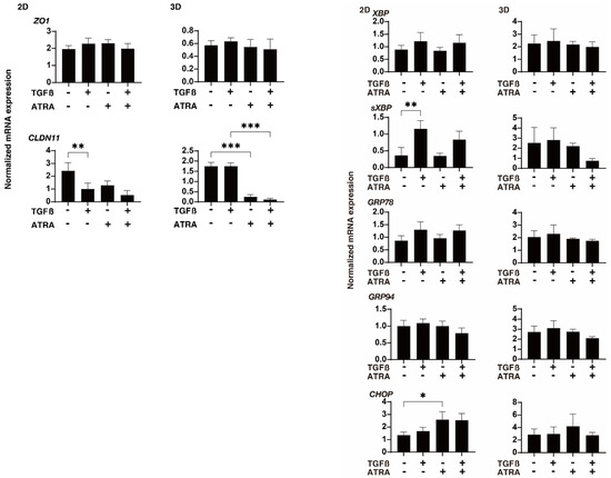 To characterize these issues and the expressions of several possible factors including ECM molecules further, regulatory factors including TIMP and MMP and ER-stress-related factors were evaluated by qPCR and/or immunocytochemistry. In terms of the gene expression of ECM proteins (Figure 4), a TGF-β2-stimulated upregulation was detected in COL1 (2D and 3D) and FN (2D), as was observed in our previous studies [24,25,28]; in contrast, an ATRA monotreatment induced a significant downregulation of COL 6 (2D and 3D) and FN (3D) and an upregulation of αSMA (3D); additionally, the addition of ATRA to TGF-β2 caused a significant downregulation of COL1 (2D), COL6 (2D and 3D), and FN (2D and 3D), and the upregulation of COL4 (2D) and αSMA (3D). An ATRA monotreatment also caused identical changes in these ECM proteins in the 3D HTM spheroids. These alterations in the expression of ECM molecules by TGF-β2 and/or ATRA were also confirmed by immunocytochemistry (Supplemental Figure S1). As shown in Figure 5, the mRNA expression of TIMPs and MMPs resulted in the following: (1) We observed a significant upregulation of TIMP1 (3D) by ATRA; an upregulation of TIMP1 (2D and 3D) and TIMP2 (2D) by TGF-β2 and ATRA, or a downregulation of TIMP2 and TIMP3 (3D) by ATRA; and a downregulation of TIMP2 and TIMP3 (3D) by TGF-β2 and ATRA, respectively. (2) MMP2 and MMP9 (2D) were substantially upregulated or downregulated by TGF-β2 or ATRA, respectively. (3) MMP 2, 9, and 14 were markedly downregulated by ATRA in the presence or absence of TGF-β2. Similar to these differences between 2D and 3D cell cultures, the mRNA expression of claudin11 (CLDN11), a TJ-related molecule, and spliced X-box binding protein (sXBP), an ER-stress-related factor, by TGF-β2 and/or ATRA was also observed (Figure 6). That is, the gene expression of CLDN11 was significantly downregulated by ATRA (2D) and TGF-β2 and/or ATRA (3D), and that of sXBP was upregulated and downregulated by TGF-β2 (2D) and TGF-β2/ATRA (3D), respectively. Therefore, these collective observations reveal that the beneficial effects of ATRA toward the glaucomatous human TM involve a suppression of the TGF-β2-stimulated increases in (1) the TEER values of the 2D monolayers and (2) the stiffness of the 3D spheroids.