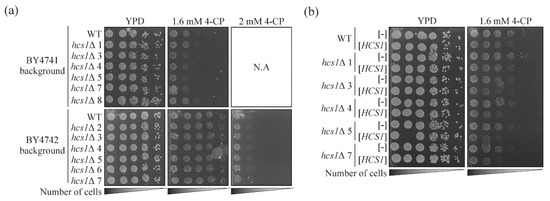 2.1. The HCS1 Deficient Strain Is Not Hypersensitive to 4-Chlorophenol on Solid YPD Medium