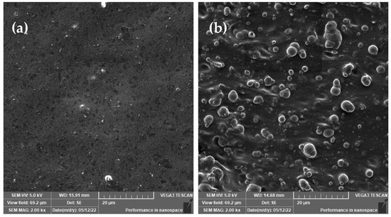 Fabricated samples were morphologically analyzed for any defects or deficiencies that occurred during the fabrication process. These included bare silicone rubber (SR) and MRE samples. Figure 1 depicts a surface and cross-section micrograph of MRE samples. The SR sample was discovered to have uniform leveled smooth surfaces similar to the cross-sectional surfaces. Further LV-SEM analysis of the MRE surface reveals a smooth with some sign of CIP lump surface, as shown in Figure 1a, and CIPs embedded with some agglomerations in the matrix of cross-sectioned MRE, as shown in Figure 1b. Carbonyl iron particles were uniformly distributed and clearly showed the isotropic condition of the sample.