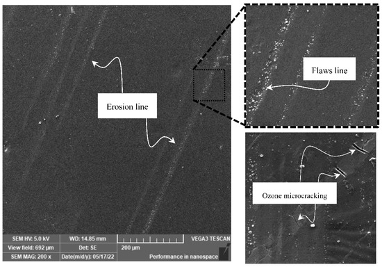 However, after 30 days of exposure, the MRE sample developed a surface defect as in Figure 2. Environmental stress was suspected to be influencing the flaws, which could be precipitated by a variety of factors such as photo-oxidation and sudden rainfall, which promoted the effect of thermal stress. The defect, was unique to the MRE sample because CIP was embedded in its elastomeric matrix. On the surface, an erosion line was observed, and this phenomenon was scattered with several parallel lines. The micro-sized eroded line showed a sign of a CIP facet on the surface, which was thought to be the beginning or initiation of ozone cracking. The onset of microcracking in the erosion line was assumed to have progressed along with environmental stress, eventually establishing ozone cracking [26]. The degradation of the MRE surface due to natural weathering was important to understand as it concomitantly manifests the expected service life of the MRE. Further investigation using FESEM led to the conclusion that the degradation could be classified as photodegradation, which was the process of material alteration caused by the interaction of sunlight and air. Degradation typically began at the surface and progresses into the bulk.