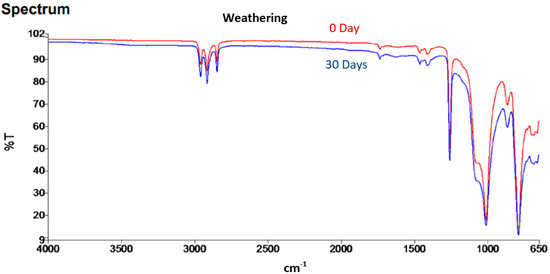 Figure 3 depicts the results of FTIR testing on test samples, which produced data in the form of a graph of wavelength (cm−1) vs. % transmission. The graph shows the presence of transmission as a peak that interpreted the bonding’s characteristic. The bonds formed in test specimens before and after the natural weathering durability procedure were depicted in this interpretation. In general, the sample showed no discernible changes, and the intensity of bond formation appeared to be the same in both conditions. However, in the FTIR graph, the peak high changes, indicating that the peak intensity decreased after 30 days. This indicated a decrease in the amount of the functional group associated with the molecular bond (per unit volume).