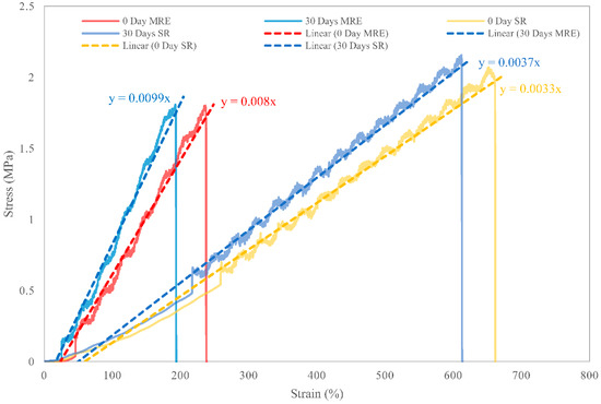 Stress–strain curves of SR and MRE samples, before and after 30 days of natural weathering exposure, and linear regression on the increment slope.