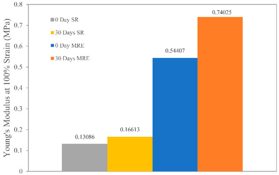 After 30 days of natural weathering, both SR and MRE samples showed an increase in stiffness with a significant consistency in total strength, indicating the ability to withstand degradation. Inevitably implied that the material was subjected to minimal environmental degradation, most likely as a result of chain scissions and photo-oxidation reactions. Photo-oxidation was attributed to enhanced brittleness and stiffness of the SR and MRE, thus increasing Young’s modulus, as depicted in Figure 5. The Young’s modulus for MRE of 0.74 MPa was measured after 30 days of weathering durability, compared to 0.54 MPa before that condition, indicating that the modulus value increased by at least 35% as a result of natural weathering or environmental stress. Similarly, a 25% increase in Young’s modulus value for SR was observed following the test.