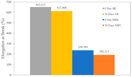 In addition to chain scission, the matrix experienced crystallinity, which could be caused by photodegradation, which rearranged segmented molecules of entangled molecules in the matrix’s amorphous phase. The degradation was more pronounced in MRE and SR due to an increase in surface layer crystallinity, which caused shrinkage when both samples were exposed to UV radiation from the sunlight. As illustrated in Figure 6, those processes reduced the sample’s elongation. Prior to weathering durability, the SR sample had the highest elongation of 650%, which dropped by 10% after that. The ability to elongate was still good even though the SR sample was predominantly composed of an amorphous structure. However, because the amorphous structure in MRE was much lower (≈30%) when combined with environmental stress factors such as photo-oxidation, ozone, crystallization, and UV radiation, MRE exhibited a nearly 20% reduction in elongation. The results obtained were in an agreement with the previous studies conducted using elastomeric polymer [21,22].