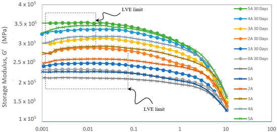 Based on the tensile test results, the investigation and evaluation of the MRE performance under natural weathering for its rheological behavior was carried out. As previously stated, it was suspected that the degradation of MRE was primarily due to molecular degradation. Because it involved a molecular aspect, rheological analysis was critical to understanding the effect on molecular structure. The storage modulus (G’) representation was then used to evaluate MRE’s ability to store deformation energy. Figure 7 depicts the experimental results of MRE storage modulus behavior under natural weathering durability. The storage modulus behavior was studied at up to 10% of strain, when G’ became strain dependent (within 0.01%) and independent (after 0.1%). The earlier region was called the linear viscoelastic region (LVE) and the characteristic of MRE in this region represented the elasticity and stiffness of the MRE sample. Magnetorheological elastomer G’ has agreed with a similar pattern from the mechanical tensile test under all conditions. The increasing G’ value in the sample indicated that the MRE was becoming stiffer as the magnetic inducement increased. However, the G’ changed only slightly when subjected to high magnetic stimulation. The materials might experience magnetically saturated in high fields. The brittleness of the MRE sample could be seen in the graph as the LVE limit has been reduced by magnetic induce currents ranging from 0 to 5 A. This was consistent with the tensile test results of elongation at break, which decreased after 30 days of weathering exposure due to crystallinity and the shrinkage of the surface from photodegradation.