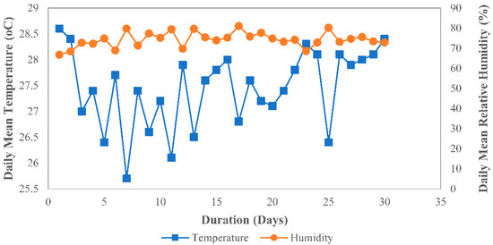 The natural weathering test was carried out for 30 days from 1st to 30th April 2022 at the Malaysia–Japan International Institute of Technology, Universiti Teknologi Malaysia, Kuala Lumpur, Malaysia. The natural weathering procedure followed the established test standards. The exposed specimens were MRE sheet samples arranged in an expose caged rack in an open area not obstructed by other objects facing south (3.1727, 101.7208)/(3.10′21.77194″ N, 10.43′14.8794″ E). To serve as a reference to the similar matrix used in the MRE, batches of SR sheets (without CIP) were prepared and exposed similarly. Finally, to determine the degree of degradation, the specimens were collected 30 days after being exposed to environmental effects. Before proceeding to further experimental evaluation, the specimens were cleaned with a cleanse cloth and left in the air for 24 h at room temperature. Figure 8 and Figure 9 depict the weather conditions during the sample’s exposure to the tropical climate. The data were obtained from the Malaysian Meteorological Department, Kuala Lumpur, Malaysia.