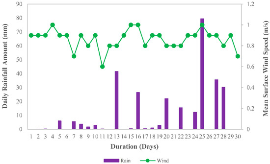 Daily rainfall amount and mean surface wind speed in April 2022.