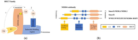 - Wang, Y.; Argiles-Castillo, D.; Kane, E.I.; Zhou, A.; Spratt, D.E. HECT E3 ubiquitin ligases—Emerging insights into their biological roles and disease relevance. J. Cell Sci. 2020, 133, jcs228072. [Google Scholar] [CrossRef]