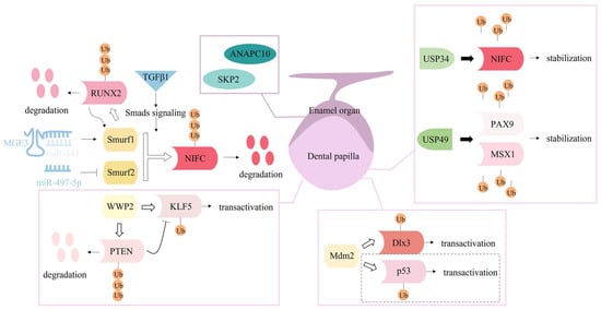 - Zheng, H.; Fu, J.; Chen, Z.; Yang, G.; Yuan, G. Dlx3 Ubiquitination by Nuclear Mdm2 Is Essential for Dentinogenesis in Mice. J. Dent. Res. 2022, 101, 1064–1074. [Google Scholar] [CrossRef]
