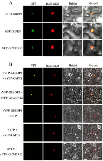 2.3. Subcellular Localization of GhBOP1 and GhPES/GhWDR12