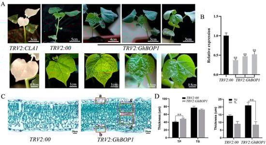 Silencing of GhBOP1 changed the flatness and morphology of cotton leaves. (A) Phenotypes of blank control and gene silenced plants. Plants from left to right are positive control (TRV2:CLA), negative control (TRV2:00) and three silent GhBOP1 lines (TRV2:GhBOP1). (B) GhBOP1 expression level in blank control and VIGS plants. GhHistone3 was used as an internal reference gene for data normalization. (C) Paraffin-sectioned phenotypes of leaves of blank control plants and wrinkled leaves of GhBOP1-silenced plants. a presents the upper epidermal cell, b presents the lower epidermal cell, c presents the palisade tissue, and d presents the spongy tissue (red box). (D) Statistics of cell thickness corresponding to the paraffin section of leaves. TU represents the thickness of the upper epidermal cells, TL represents the thickness of the lower epidermal cells, TP represents the thickness of the palisade tissue, and TP represents the thickness of spongy tissue. Asterisks denote statistical significance as follows: ** p ≤ 0.01.
