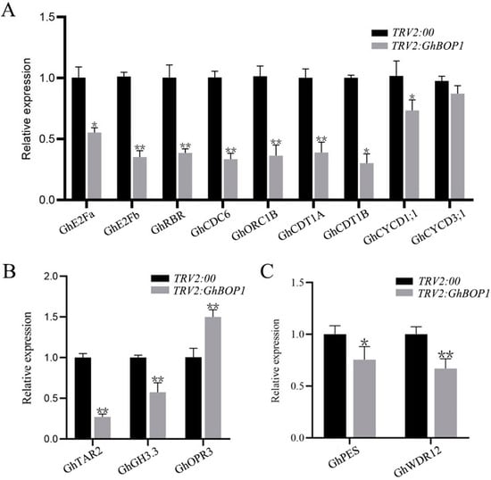 2.5. Expression of Jasmonic Acid, Cell Cycle, and Auxin Related Genes in GhBOP1-Silenced Lines
