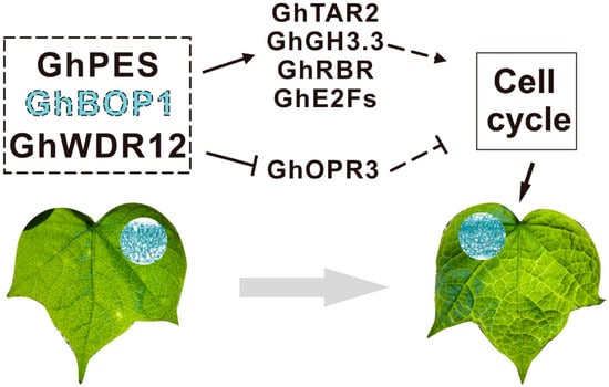 The growth and development of plants are controlled by plant hormones, among which auxin and jasmonic acid play important roles in the processes of cell division, cell expansion, and cell differentiation [,,,]. A coordinated mechanism exists between auxin and ribosome biogenesis that regulates plant growth and development []. Most of the ribosome mutants were characterized by various abnormal phenotypes related to auxin. Altered expression levels of numerous genes associated with auxin biosynthesis, transport, and signal transduction were observed [,,,]. In GhBOP1-silenced plants, the expression levels of the auxin biosynthesis-related genes (GhTAR2 and GhGH3.3) were significantly lowered, and the expression level of the jasmonic acid biosynthesis-related gene GhOPR3 was significantly elevated (Figure 5B). The expression of the major cell cycle regulators, such as E2Fa, CycD, and CDKA, and the G1/S transition process are regulated by this class of hormones [,]. The stability of the E2Fb protein increased under conditions of auxin modulated proteolysis []. The progression of the cell cycle is inhibited by the treatment of jasmonic acid in synchronized tobacco BY-2 cells. The process is inhibited when G1/S and G2/M transitions are blocked []. The growth of the Arabidopsis leaf is suppressed under the action of methyl jasmonate. Growth suppression can be realized by inhibiting the processes of cell proliferation and expansion. Under these conditions, the life cycle of the leaf cells is arrested in the G1 phase []. Auxin also controls the process of leaf morphogenesis [].