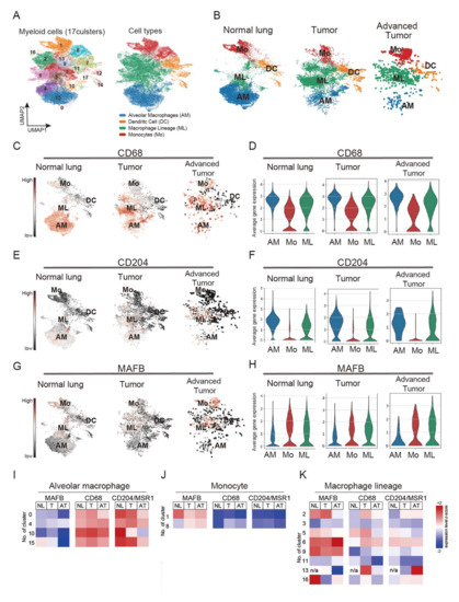 Single-cell RNA sequencing (scRNA-seq) analysis obtained from 44 patients with treatment-naive lung adenocarcinoma. Single-cell RNA raw data included normal lung tissue (n = 11), tumor tissue (stage I and III, n = 7), and advanced tumor tissue (stage IV, n = 4). Raw data were downloaded and processed using sctransform function in Seurat (v3). (A) Identified 17 clusters of the myeloid population. (B) monocytes (Mo), alveolar macrophages (AM), macrophages lineage (ML), and dendritic cells (DC) cluster distribution in normal lung tissues, tumors, and advanced tumors. (C,D) CD68 expression pattern in normal lung tissues, tumor, and advanced tumor. (E,F) CD204 expression pattern in normal lung tissues, tumor, and advanced tumor. (G,H) MAFB expression pattern in normal lung tissues, tumor, and advanced tumor. (I) Heatmap analysis of the expression of MAFB, CD68, and CD204 in AM. (J) Heatmap analysis of the expression of MAFB, CD68, and CD204 in monocytes. (K) Heatmap analysis of the expression of MAFB, CD68, and CD204 in macrophage lineage.