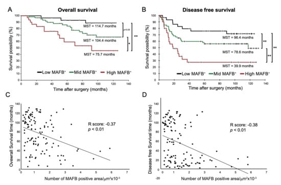 In terms of DFS, the MST in the low-, mid-, and high-MAFB+ group was 96.4 months, 78.6 months, and 39.9 months (p < 0.001, log-rank test), respectively (Figure 3B). Compared with the MST of nodal involvement; negative (−) with an OS of 109.0 months and positive (+) with an OS of 92.4 months; the low-MAFB+ patients showed longer OS than patients with (−) nodal involvement and high-MAFB+ patients showed a 17 month shorter OS than patients with nodal involvement (Figure S4 and Figure 3A,B).