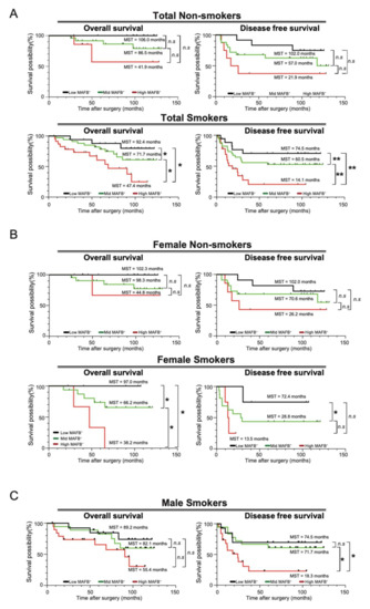 OS and DFS analysis in smokers and non-smoker patients. Kaplan–Meier analysis of (A) the overall survival and disease-free survival of the low-MAFB+, mid-MAFB+, and high-MAFB+ in the total smoking and non-smoking patients; (B) the overall survival and disease-free survival of the low-MAFB+, mid-MAFB+, and high-MAFB+ in female smoker and non-smoker groups; and (C) the overall survival and disease-free survival of the low-MAFB+, mid-MAFB+, and high-MAFB+ in male smoker and non-smoker groups. Difference in survival was compared using log-rank test. *, p < 0.05; **, p < 0.01.