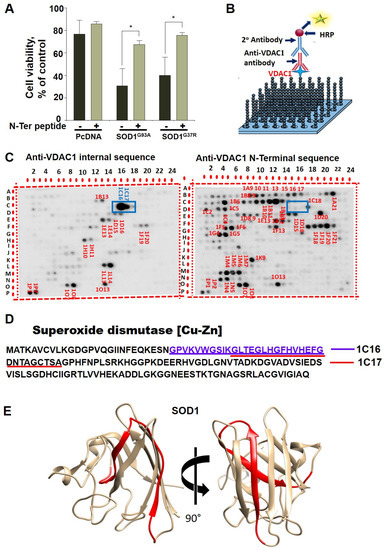 Identification of VDAC1 interacting sites in SOD1. (A) SH-SY5Y cells (4.5 × 104 cells/well in 24-well plates) were transfected with an empty plasmid or a plasmid encoding for mutant SOD1G93A or SOD1G37R. Then, 24 h post-transfection, the cells were incubated for 5 h with (10-20)N-Ter-Antp peptide (20 µM) and then analyzed for cell death. The results are from triplicates of different biological repeats (n = 3) and are presented as the means ± SEM. * p < 0.05. (B) Schematic presentation of peptide arrays and detection of VDAC1-interacting peptides. (C) Glass-bound peptide array consisting of 768 overlapping peptides derived from 19 VDAC1-interacting proteins were incubated for 4 h with purified VDAC1 (64 nM) and then blotted with anti-VDAC1 antibodies against an internal sequence (1:5000) or with antibodies against the VDAC1-N-terminus, followed by incubation with HRP-conjugated anti-mouse IgG and detection using a chemiluminescence kit. Dark spots represent binding of VDAC1 to peptides derived from VDAC1-interacting proteins. Spots 1C16 and 1C17 (squared) represent SOD1-derived peptides interacting with VDAC1 as detected with anti-VDAC1 antibodies directed to an internal sequence, but not against the N-terminus. (D) SOD1 sequence with the two overlapping interacting peptides is indicated. (E) The 3D structure of the SOD1 (PDB_ID 1PU0) with the identified peptide localization indicated (in red ribbon). Images were prepared with UCSF-Chimera [50].