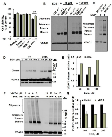 VDAC1 oligomerization is increased in mutant SOD1G93A spinal cord mitochondria. (A) NSC-34 cells were transfected to express the human SOD1WT, the human mutant SOD1G93A, or non-transfected (control), and 24 h post-transfection, cells were incubated with or without VBIT-12 (15 µM) for 12 h. A cell viability analysis was performed using the CellTiter 96 AQueous One-Solution cell proliferation assay using a plate reader at 490 nm. (B,C) Spinal cord mitochondria (1 mg/mL) from non-transgenic, SOD1WT or SOD1G93A rats were incubated for 10 min at 30 °C in 10 mM Tricine, pH 8.2, with the indicated concentration of the crosslinking reagent EGS (B) or DSP (C). Sample buffer for electrophoresis containing 2-mercaptoethanol, except for DSP (S-S-containing reagent), was added, and the samples were subjected to SDS/PAGE (10% gel) and immunoblot analysis using anti-VDAC1 antibodies. (D,E) Spinal cord mitochondria (1 mg/mL, n = 3) from non-transgenic or SOD1G93A mice were incubated for 20 min at 30 °C in PBS, pH 8.3, with the indicated concentration of EGS, and subjected to SDS-PAGE (10%), immunoblotting (D), and quantitative analysis (E). (F,G) Spinal cord mitochondria isolated from SOD1G93A mice were pre-incubated with VBIT-4 (10 min, 20 μM) and subjected to cross linking as described in D. Samples were subjected to SDS/PAGE 4–15% gradient gel and immunoblotting using anti-VDAC1 antibodies (F) and to dimer quantitative analysis (G). VDAC1 dimer levels were quantified using ImageJ software. The positions of VDAC1 monomers, dimers, trimers, tetramers, and higher oligomers are indicated. The results are from triplicates of different biological repeats (n = 3) and are presented as the means ± SEM. ** p < 0.005.