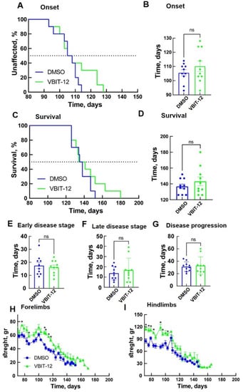 Next, we selected VBIT-12, administrated intraperitoneally (IP), starting at 60 days. IP injection of VBIT-12 every other day showed a positive tendency in delaying disease onset (Figure 5A,B) and survival of SOD1G93A mice, although this was not statistically significant (Figure 5C–G).